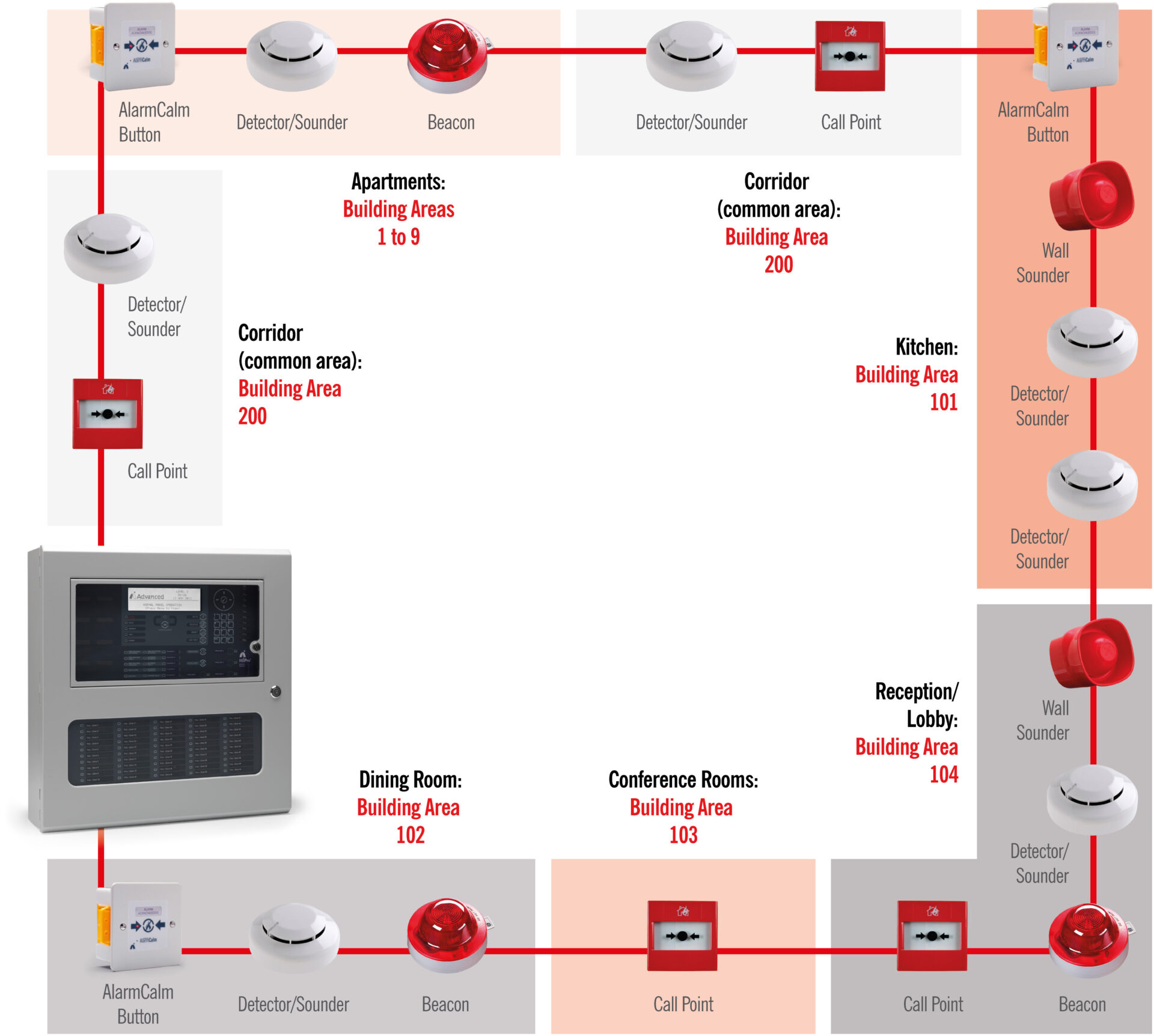 Building areas are independent of detection zones and are assigned to parts of a building to enable the precise programming of alarm verification and investigation delays to outputs.
